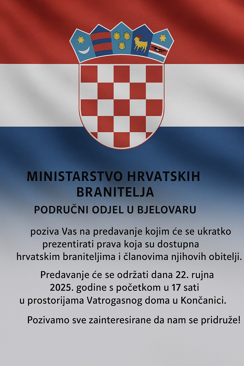 Predavanje ! 15. rujna 2025. 17:57 Oglasna PločaNavigacija objavaPrevious Previous post: Javni poziv za savjetovanje sa zainteresiranom javnošću u postupku donošenja Plana upravljanja nekretninama i pokretninama u vlasništvu Općine Končanica za 2026. godinu.Next Next post: Održana podjela paketa krajnjim korisnicima Projekta „Zaželi bolje sutra-Faza IV“ za rujan 2025. godine